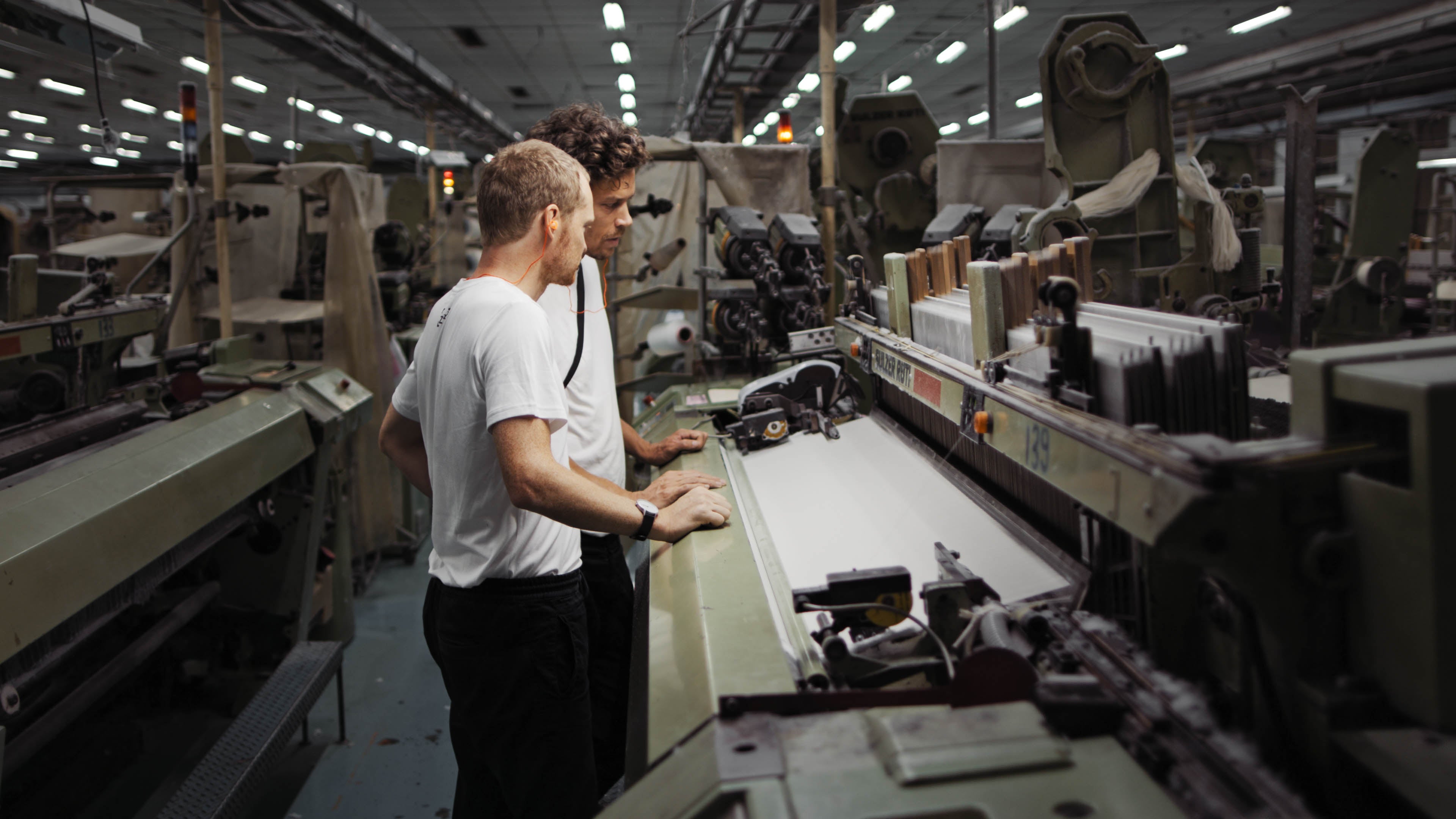 QWSTION co-founders Christian Kägi and Matthias Graf at the partner weaving mill.