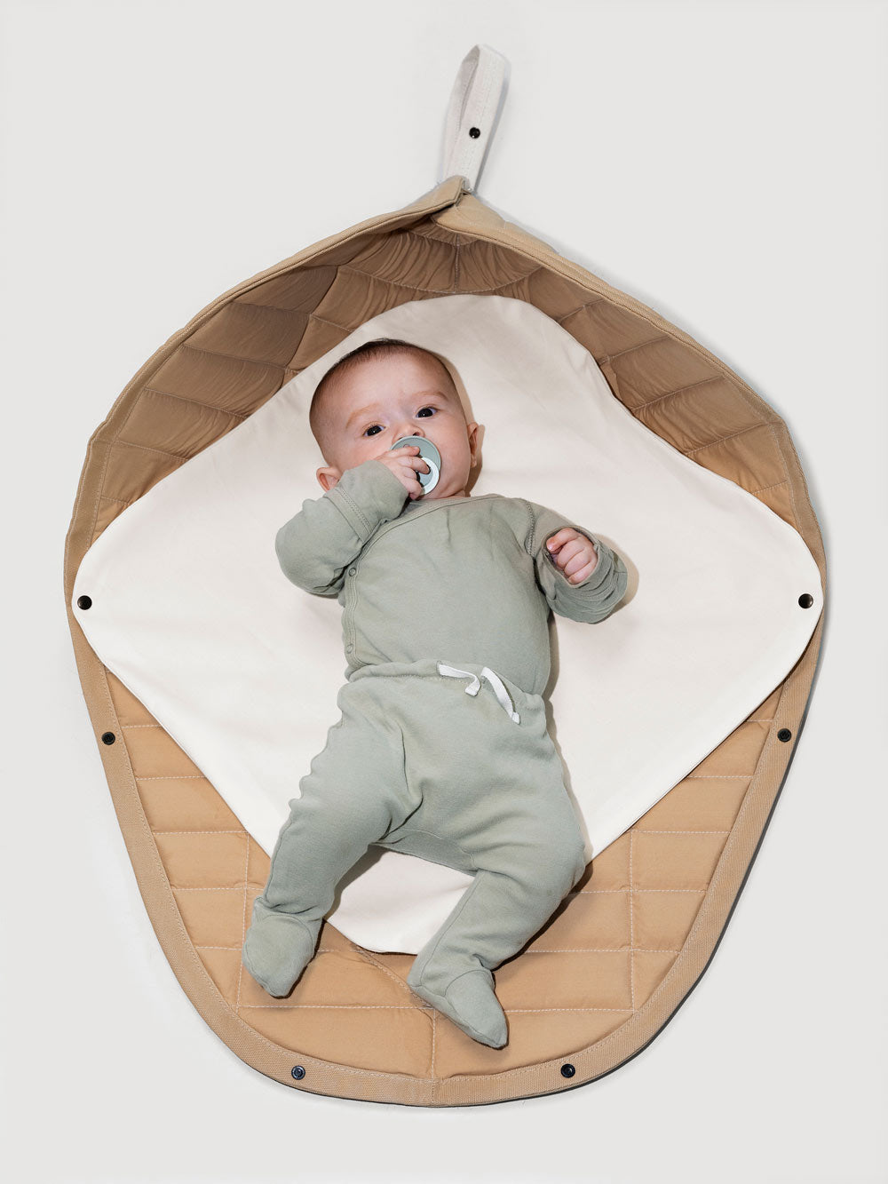Babybo is a portable baby nest that offers a safe environment for 0-6 months babies. The mattress core is made from a hypoallergenic and breathable mycelium foam, tuned into different densities for comfort and stability, and further heat-pressed into soft panels creating an easy fold. The compact design is easily transformed into a play mat, changing pad, shelter or sleeping pod, depending on how the buttons are closed.